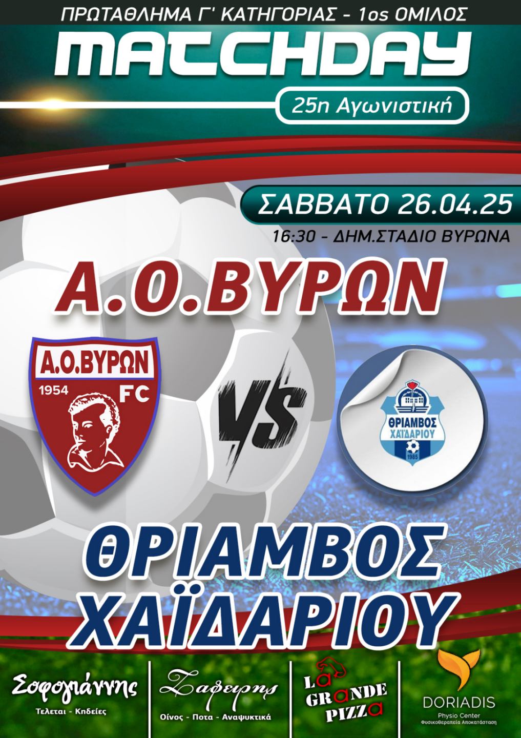 ΑΓΩΝΑΣ ΠΡΩΤΑΘΛΗΜΑΤΟΣ ΑΝΔΡΙΚΟΥ : Α.Ο.ΒΥΡΩΝ - ΘΡΙΑΜΒΟΣ ΧΑΪΔΑΡΙΟΥ, ΣΑΒΒΑΤΟ 26/04/2025, ΩΡΑ 16:30, ΔΗΜΟΤΙΚΟ ΣΤΑΔΙΟ ΒΥΡΩΝΑ