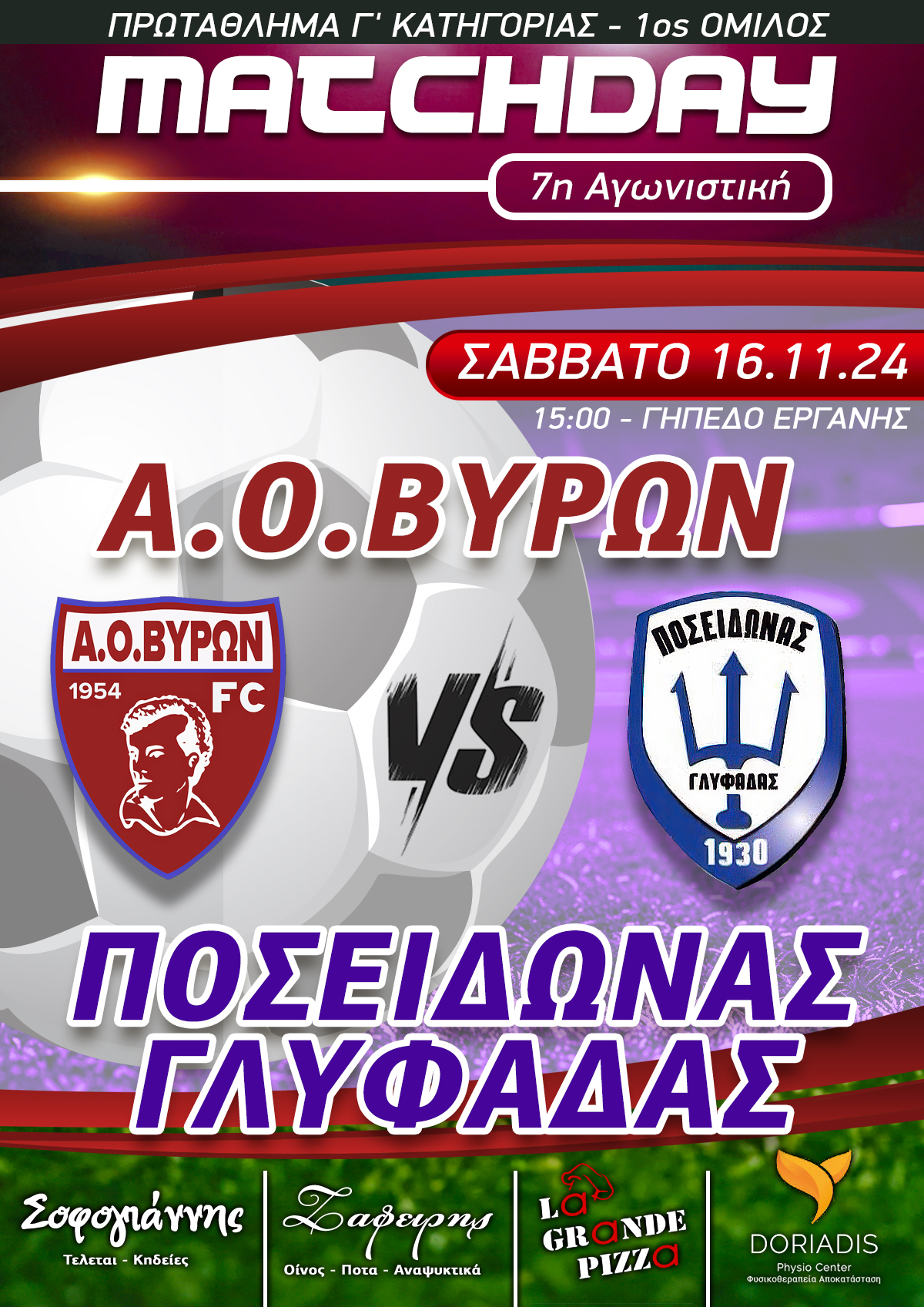 ΕΠΟΜΕΝΗ ΑΓΩΝΙΣΤΙΚΗ : Α.Ο.ΒΥΡΩΝ - ΠΟΣΕΙΔΩΝΑΣ ΓΛΥΦΑΔΑΣ ΣΑΒΒΑΤΟ 16/11/2024 ΩΡΑ 15:00 ΓΗΠΕΔΟ ΕΡΓΑΝΗΣ